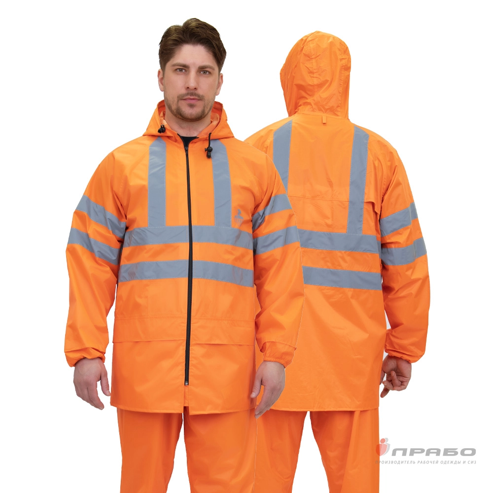 Мужской влагозащитный костюм сигнального цвета сделан из ткани яркого оранжевого цвета. На спине, груди, рукавах и брюках нашиты светоотражающие полосы шириной 50 мм. Нанесение СОП соответствует ГОСТу. Такой костюм делает работника более заметным в тёмное время суток, в сумерках, в сильный дождь, туман и в условиях частичного задымления. Модель выбирают для дорожных рабочих, сотрудников служб ЖКХ, монтажников, портовых служащих, АЗС, парковок и других мест, где нужна надёжная защита от непогоды.