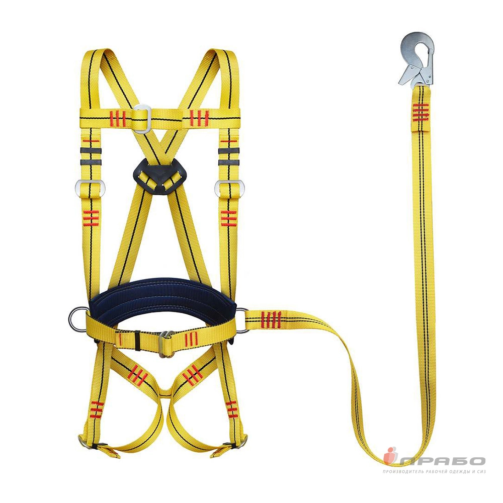 Страховочные привязи с наплечными и набедренными лямками служат для снижения вероятности травмирования в случае падения рабочего при выполнении работ на высоте. Данная страховочная привязь может быть укомплектована стропом нестандартной длины и/или специальным длинномерными спасательным стропом из ленты или каната, что позволит использовать её для обеспечения безопасности работ в колодцах, резервуарах и других замкнутых пространствах, а также для целей спасения, страховки и экстренной эвакуации работника. Пояс снабжен страховочным стропом из полиамидной ленты с наплечными и набедренными лямками.