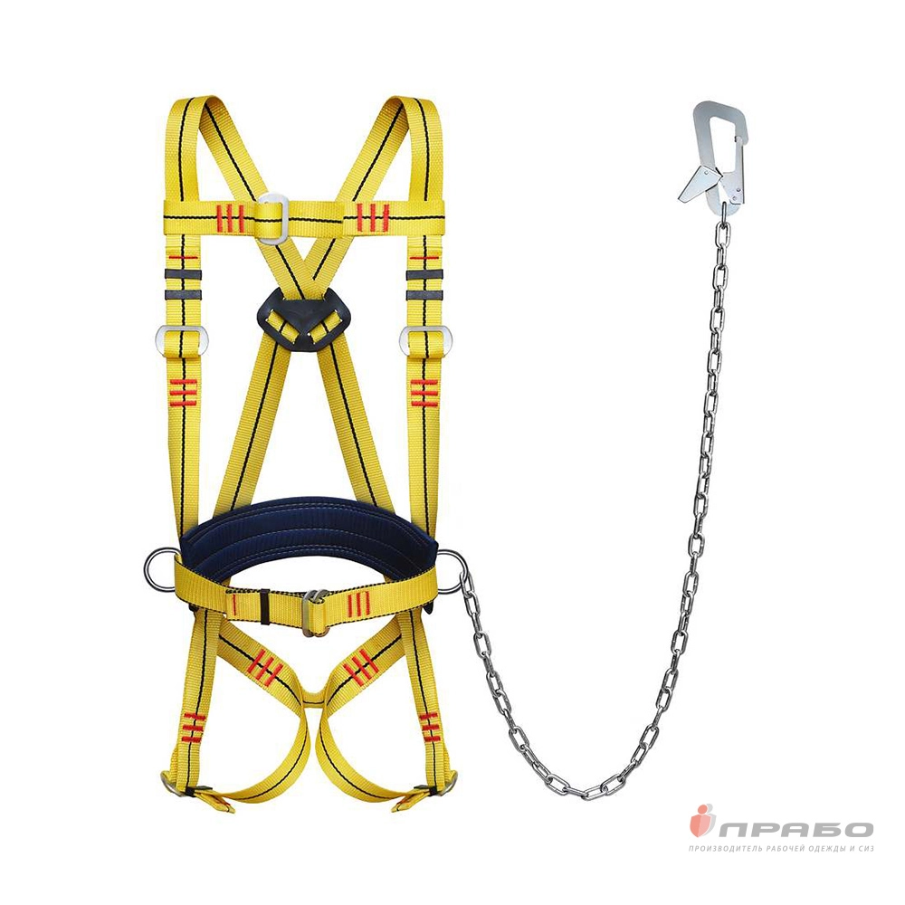 Страховочные привязи с наплечными и набедренными лямками служат для снижения вероятности травмирования в случае падения рабочего при выполнении работ на высоте. Данная страховочная привязь может быть укомплектована стропом нестандартной длины и/или специальным длинномерными спасательным стропом из ленты или каната, что позволит использовать её для обеспечения безопасности работ в колодцах, резервуарах и других замкнутых пространствах, а также для целей спасения, страховки и экстренной эвакуации работающего. Пояс снабжен наплечными и набедренными лямками и фалом из цепи.