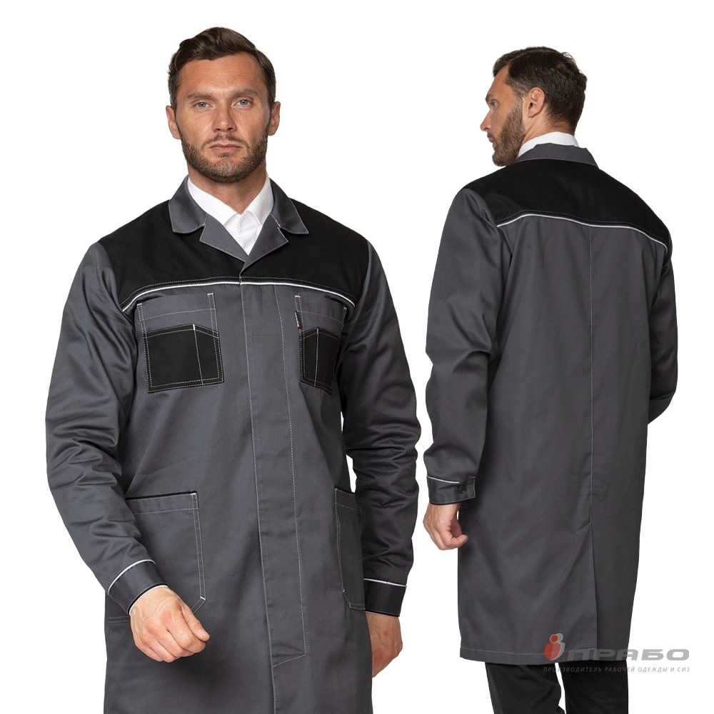 Мужской халат «Бренд 2020» подходит для работы в цехах и на производствах, защищает от различных видов общепроизводственных загрязнений, а также дарит комфорт