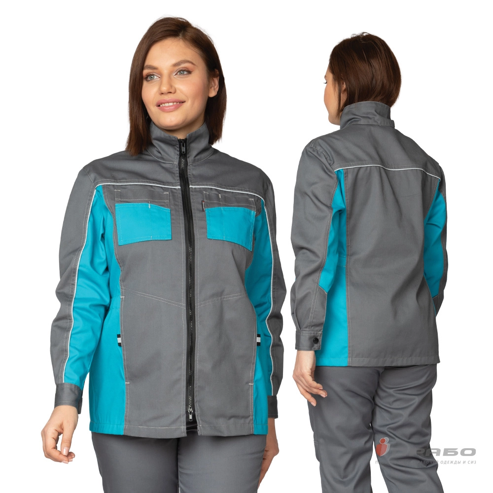 Костюм женский «Бренд 1» 2020 — это отличный вариант летней спецодежды для любых видов работ. Представленная в нашем каталоге серо-бирюзовая модель не маркая, смотрится стильно и имеет хорошие показатели прочности. Изюминка модели — это воротник-стойка. Костюм состоит из куртки и брюк прямого кроя. Он выполнен из смесовой ткани, в составе которой 35% хлопка и 65% полиэстера, с водоотталкивающей пропиткой. В этом костюме можно работать с нетоксичными растворами, ткань устойчива к истиранию и производственным загрязнениям.