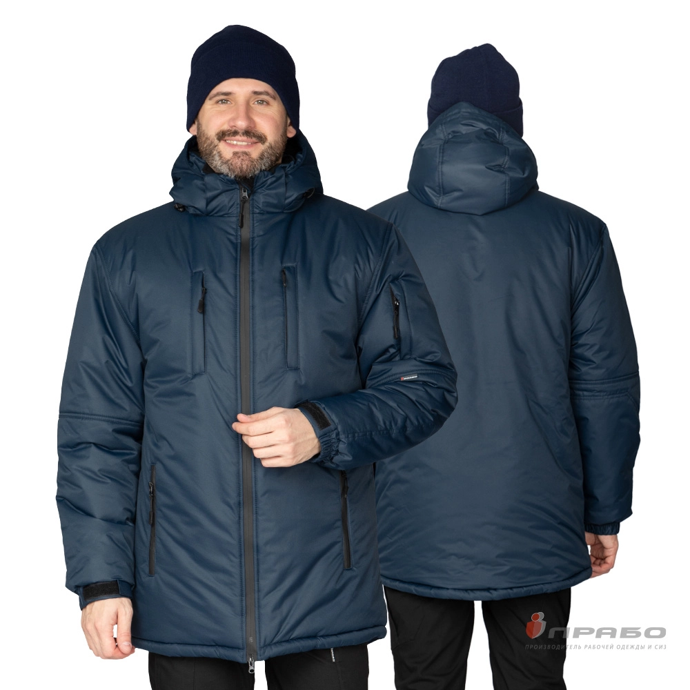 Куртка: прямого силуэта с притачной теплозащитной простёганной вертикальными строчками подкладкой, с центральной застёжкой на двухзамковую влагозащитную молнию с внутренней утеплённой ветрозащитной планкой. Верхняя часть молнии закрывается мягкой планкой из основной ткани, которая защищает подбородок от защемления и не доставляет дискомфорт при носке. Воротник-стойка утеплённый, внутренний воротник из флиса. На верхнюю часть воротника настрочены клапаны с кнопками для пристёгивания концов капюшона, это даёт возможность фиксации воротника в вертикальном положении с помощью его удлиненных краёв на кнопки без одновременного застёгивания нижней части капюшона. Рукава одношовные, низ рукава с притачной манжетой, манжета частично с эластичной тесьмой, объём дополнительно регулируется при помощи паты с застёжкой на контактную ленту. Низ куртки регулируется по объёму при помощи шнура и фиксаторов в боковых швах.