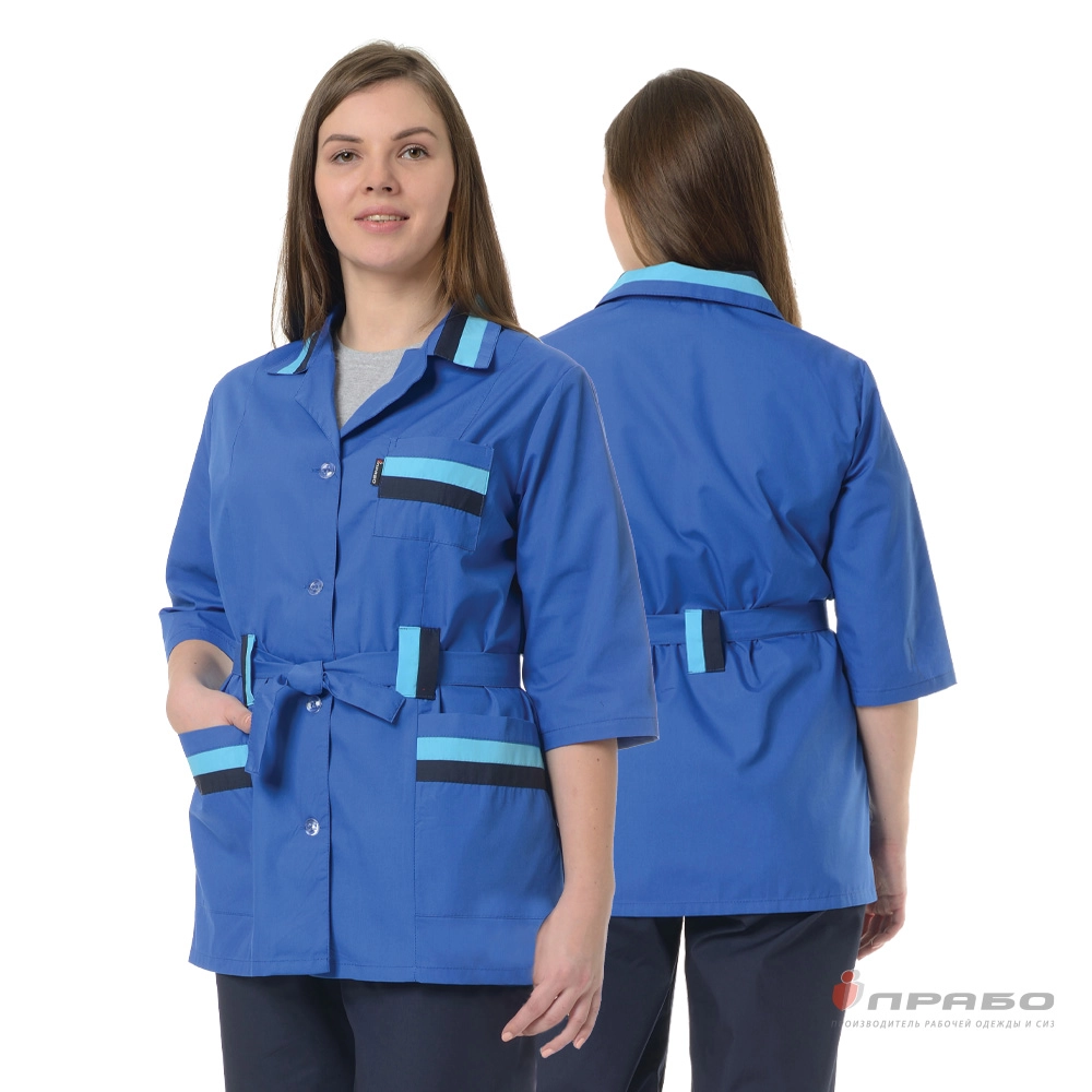 Это усовершенствованная модель униформы для медицинских работников и рабочего персонала сферы обслуживания. Она отличается оригинальным дизайном за счет удлиненного блузона цвета василек с контрастной отделкой карманов и V-образного воротника, а также темных брюк полуприлегающего кроя.