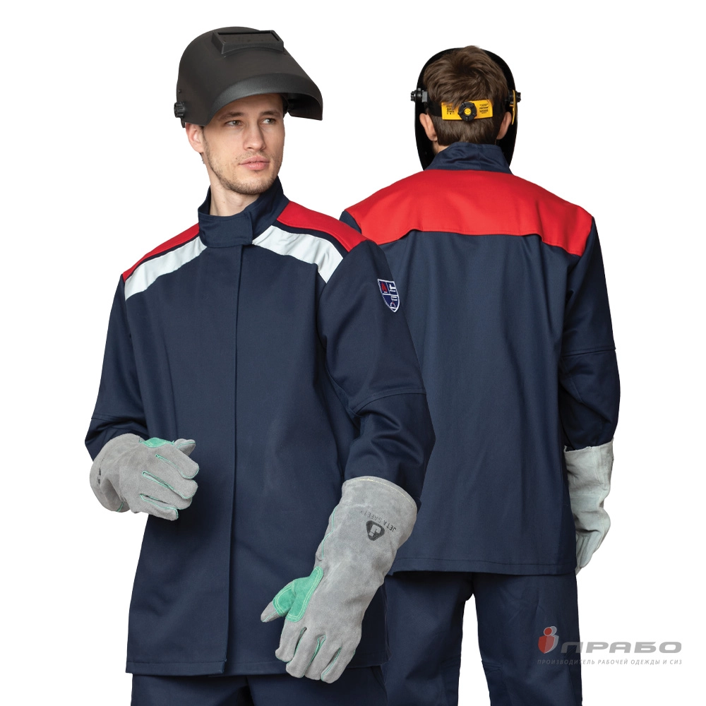 Куртка: прямого силуэта, с центральной супатной правосторонней застёжкой на пуговицы с уловителями для пуговиц. Под рукавами: на полочке под проймой, на локтевой части рукава под проймой — вентиляционные отверстия. Воротник-стойка с застежкой на контактную ленту. Низ рукавов с внутренними огнестойкими напульсниками, которые защищают от попадания внутрь искр и брызг от расплавленного металла. Конструкция рукава анатомическая, разработана с учётом особенностей работы сварщика. На левом рукаве шеврон. На спинке по шву притачивания кокетки вентиляционные отверстия.