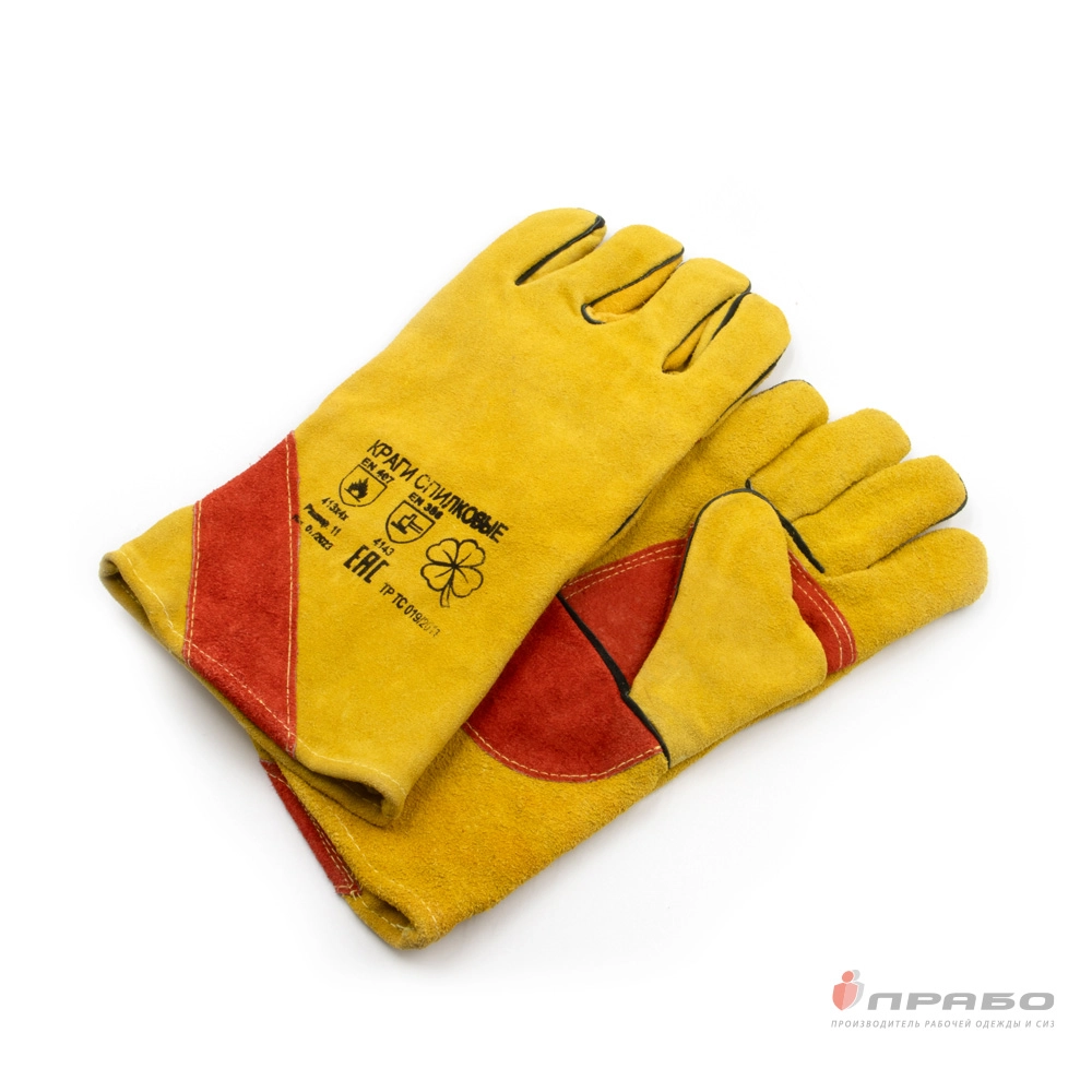 Пятипалые краги из высококачественного спилка максимально защищают от механических повреждений, жара, пламени, искр. Ладонь усилена дополнительным слоем спилка. На тыльной и ладонной части дополнительный термоизолирующий слой флиса. Раструб шириной 19 см позволяет легко фиксировать крагу поверх одежды.