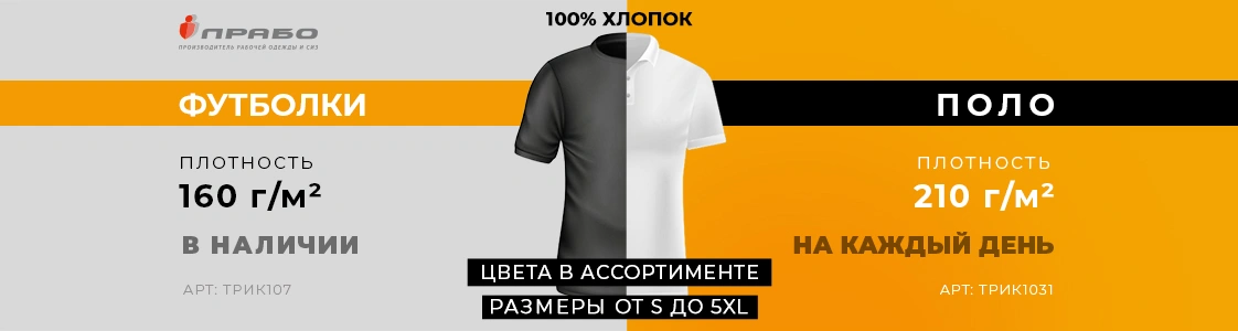 В каталоге компании «ПРАБО» представлены поло и футболки широкого размерного ряда от S до 5XL и разнообразных цветов по самым доступным ценам. Купить трикотажные изделия можно оптом или в розницу (от 1 штуки) на сайте интернет-магазина спецодежды «ПРАБО» в Москве.