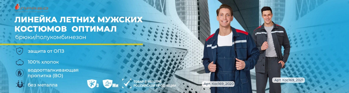 Летние мужские костюмы Оптимал 1 и Оптимал 2 отличаются комплектацией: первый с брюками, второй — с полукомбинезоном.