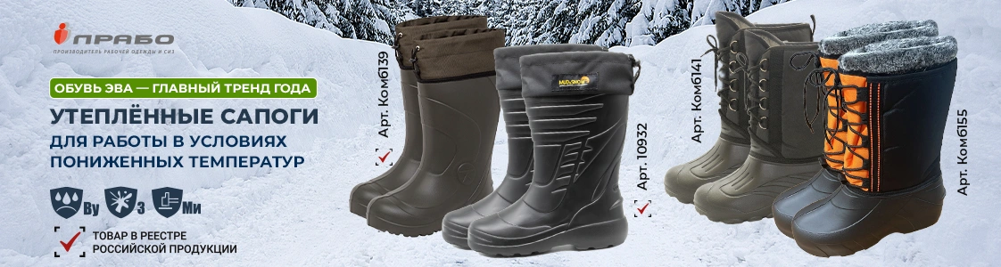 Для работы в холодное время года, особенно при низких температурах и высокой влажности, компания «ПРАБО» рекомендует современную защитную спецобувь — утеплённые рабочие сапоги из ЭВА. Это оптимальное решение для защиты ног, сочетая в себе лёгкость, теплоизоляцию и защитные свойства, необходимые для безопасной работы в зимних условиях.