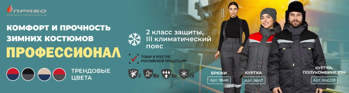 В каталоге «ПРАБО» представлены модели зимней спецодежды «Профессионал», которые созданы для эффективной защиты от общепроизводственных загрязнений и являются идеальным выбором для специалистов, работающих в условиях пониженных температур, соответствуют 2 классу защиты в III климатическом поясе. Линейка моделей включает в себя: